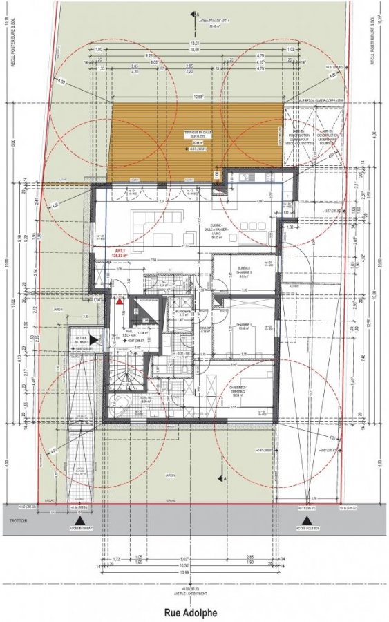 Les appartements du r.d.ch de 139 m2, avec 56 m2 de terrasse, et au 1 .étage appartement de 3 chambres de 136 m2, avec balcon de 13.15 m2 peuvent aussi convenir pour professions libérales comme p.ex. : Cabinets médicaux ou d‘avocats.